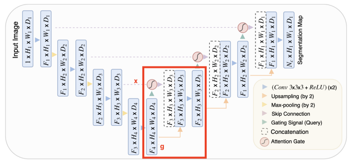 将注意力分布乘上跳转连接特征图,只保留重要的部分。这种注意力分布是从所谓的query(输入)和value(跳跃连接)中提取出来的。注意力操作允许有选择地选择包含在值中的信息。此选择基于query。