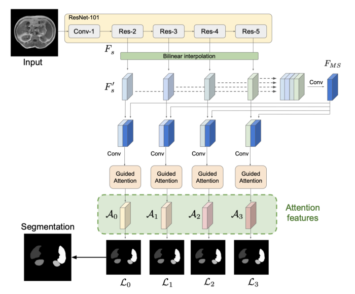 第一部分是从图像中提取特征。为此,我们将输入图像输入到一个预先训练好的ResNet中,提取4个不同层次的特征图。这很有趣,因为低层次的特征往往出现在网络的开始阶段,而高层次的特性往往出现在网络的结束阶段,所以我们将能够访问到多种尺度的特征。使用bilinear插值将所有的特征图上采样到最大的一个。这给了我们4个相同大小的特征图,它们被连接并送入一个卷积块。这个convolutional block (multi-scale feature map)的输出与4个feature map的每一个都连接在一起,这给出了我们的attention blocks的输入,这个输入比之前的要复杂一些。