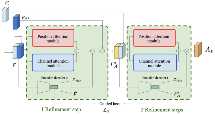 引导注意力为每个尺度建立一个连续的多个细化步骤(在提出的结构中有4个尺度)。输入特征图被送至位置和通道输出模块,输出单个特征图。它还通过了一个自动编码器,该编码器对输入进行重建。在每个block中,注意力图是由这两个输出相乘产生的。然后将此注意力图与之前生成的多尺度特征图相乘。因此,输出表示了我们需要关注特定的尺度的哪个部分。然后,通过将一个block的输出与多尺度的注意力图连接起来,并将其作为下一个block的输入,你就可以获得这样的引导注意力模块的序列。