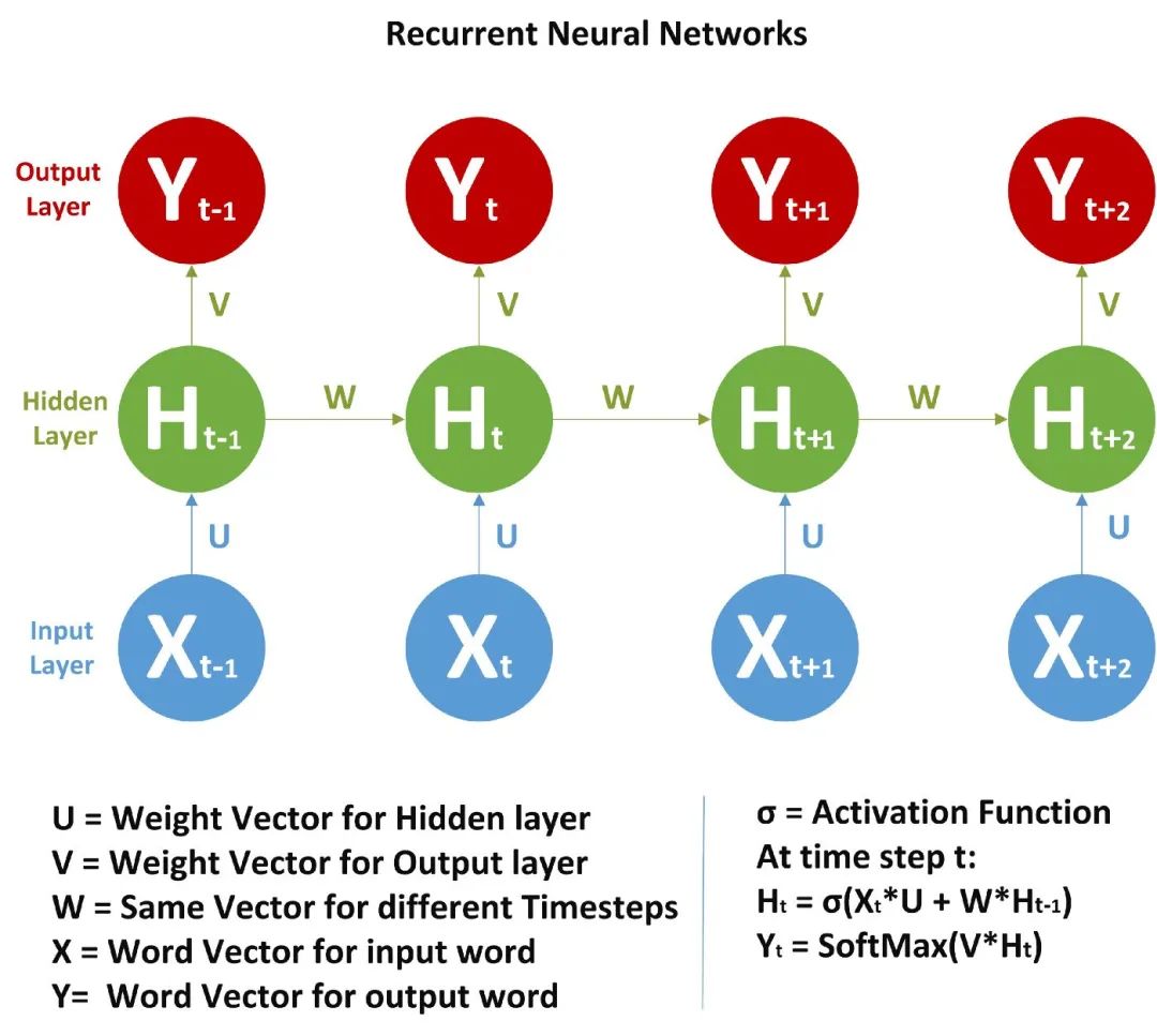 是之前的时间步长。我说过 W 对所有时间步长来说都是一样的。激活函数可以是 Tanh、Relu、Sigmoid 等。