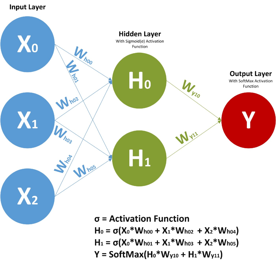 上面,我们有权值 Wy10 和 Wy11,分别对应于两个不同的层相对于输出 Y 的权值,而 Wh00、Wh01 等代表了不同神经元相对于输入的不同权值。