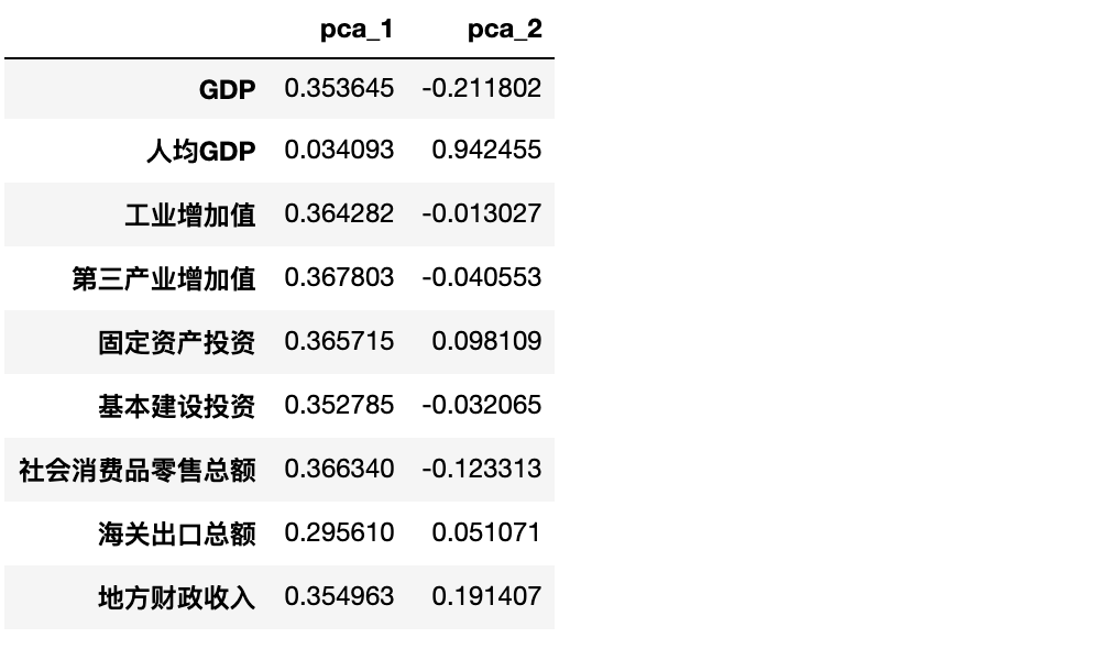 主成分2受data的第二个自变量 人均GDP影响最大,达到了0.94