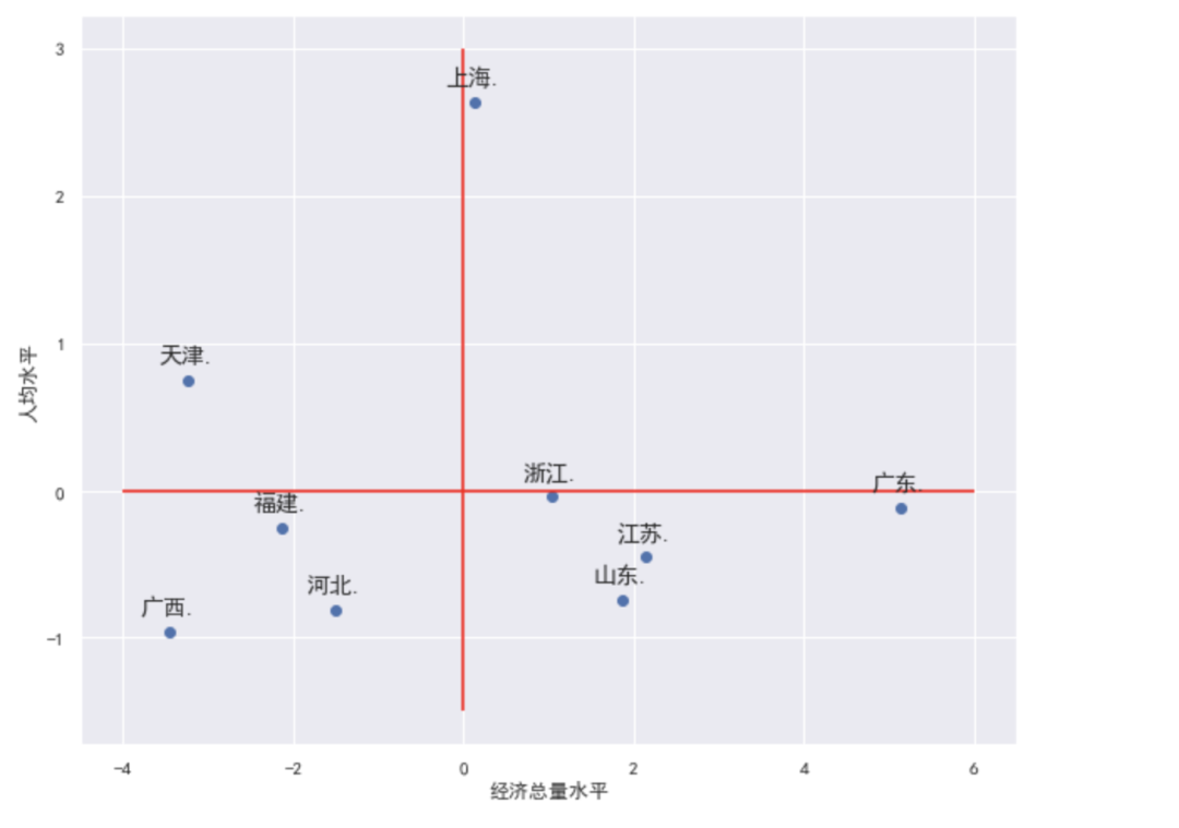 第一个主成分在表达经济总量的指标上的权重相当,可考虑命名为经济总量水平;而第二个主成分只在人均GDP上权重很高,可暂时考虑命名为人均水平