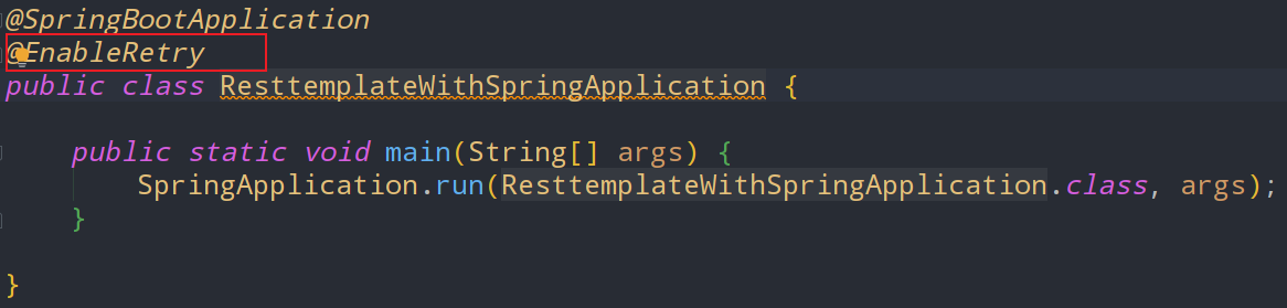 在Spring Boot 应用入口启动类,也就是配置类的上面加上@SpringRetry注解,表示让重试机制生效。