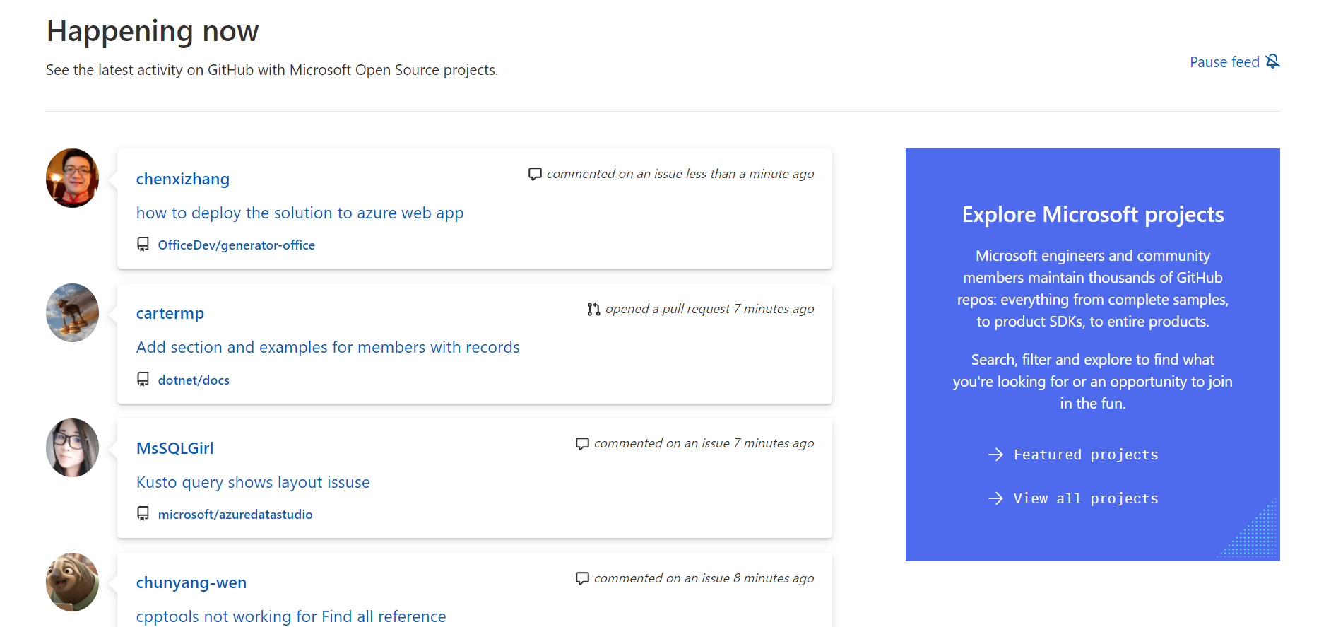 其中,“参与”页面还会实时显示微软各个 GitHub repo 的最新动态。