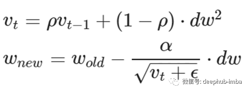 Rmsprop是由著名计算机科学家Geoffrey Hinton (Hinton et al., 2012)提出的另一种高效优化算法。该算法的工作原理与Adagrad相似,只是稍加修改。不像AdaGrad那样取梯度平方的累积和,我们取这些梯度的指数移动平均值。使用指数平均的原因是为了给最近更新的梯度权重大于最近更新的梯度。下面的方程式显示了Rmsprop的更新规则。