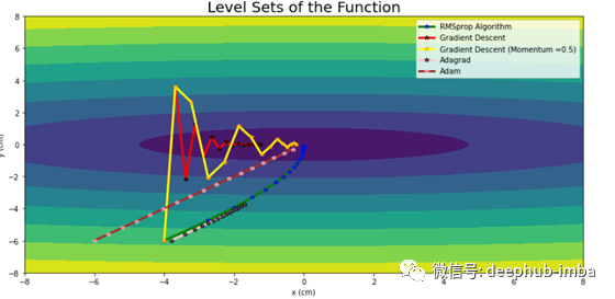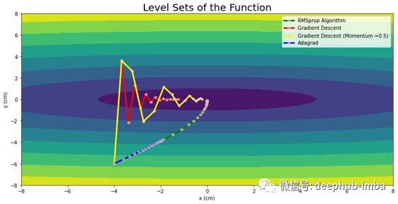 从上图中可以看出,Adagrad虽然运动平稳无振荡,但收敛能力不足。为了解决这个问题,Geoffrey Hinton引入了一个更有效的优化器RMSprop。