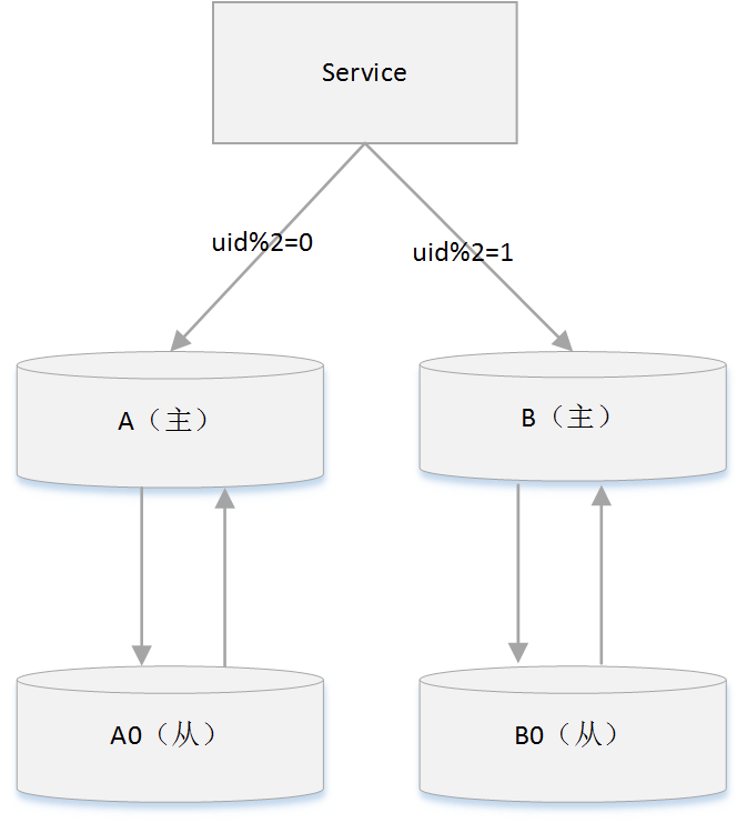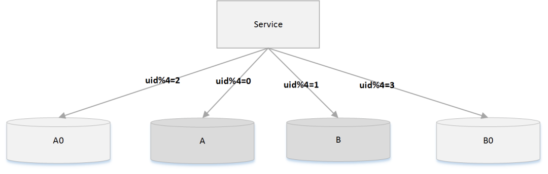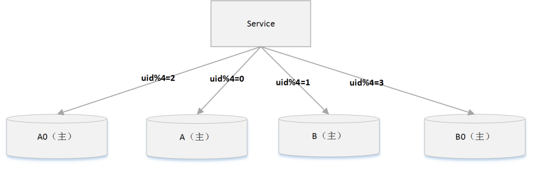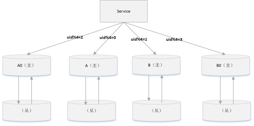假设此时如果需要扩容,新增两个分库的话,那么可以将A0、B0升级为主库,如此原先的两个分库将变为4个分库。与此同时,将上层服务的分片规则进行更改,将原先uid%2=0(原先存在A库)的数据分裂为uid%4=0和uid%=2的数据分别存储在A和A0上;同时将uid%2=1(原先存在B库)的数据分裂为uid%4=1和uid%=3的数据分别存储在B和B0上。而因为A0库和A库,B0库与B1库数据相同,所以这样就不需要进行数据迁移了,只需要变更服务的分片规则配置即可。之后结构如下: