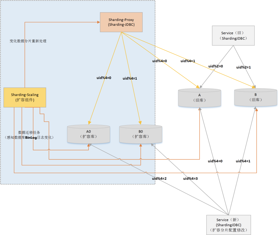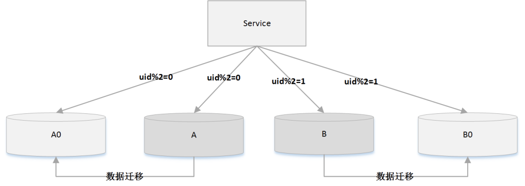 如上图所示原先的A、B两个分库,其中uid%2=0的存放在A库,uid%2=1的存放在B库;增加新的数据库,其中写入A库是双写A0库,写入B库时双写B0库。
