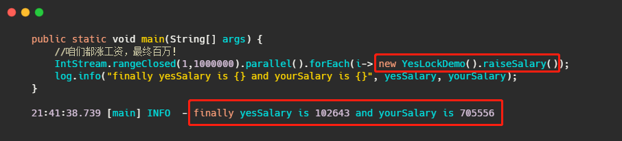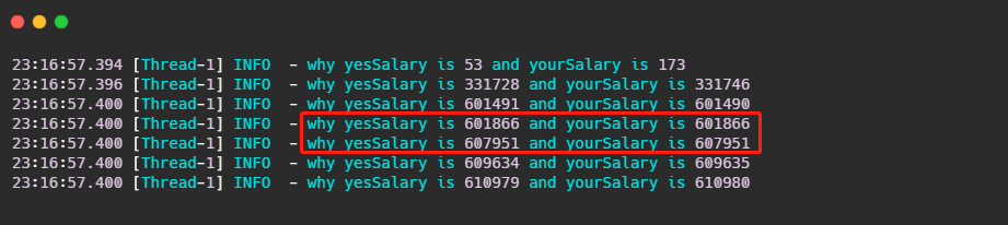 可以看到首先有 log 打出来就已经不对了,其次打出来的值竟然还相等!有没有出乎你的意料之外?有同学可能下意识就想到这就raiseSalary在修改,所以肯定是线程安全问题来给raiseSalary 加个锁!
