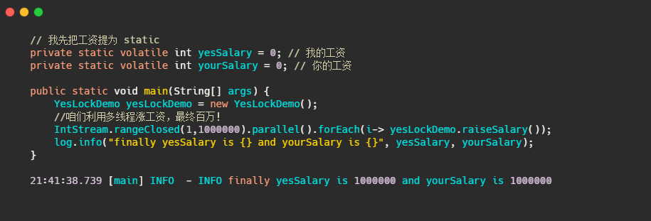 再者由于用 volatile 修饰保证了可见性,所以当打 log 的时候,可能yourSalary++已经执行完了,这时候打出来的 log 才会是yesSalary == yourSalary。