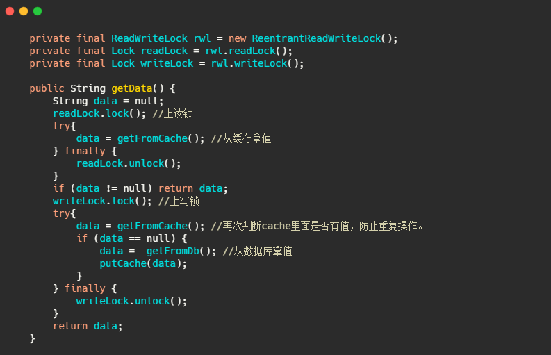 这里面的小细节就是再次判断 data = getFromCache() 是否有值,因为同一时刻可能会有多个线程调用getData(),然后缓存都为空因此都去竞争写锁,最终只有一个线程会先拿到写锁,然后将数据又塞入缓存中。