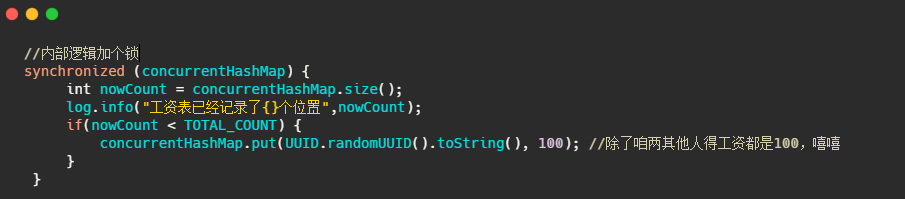 我们先来看下以下的代码,简单的说就是利用 ConcurrentHashMap 来记录每个人的工资,最多就记录 100 个。
