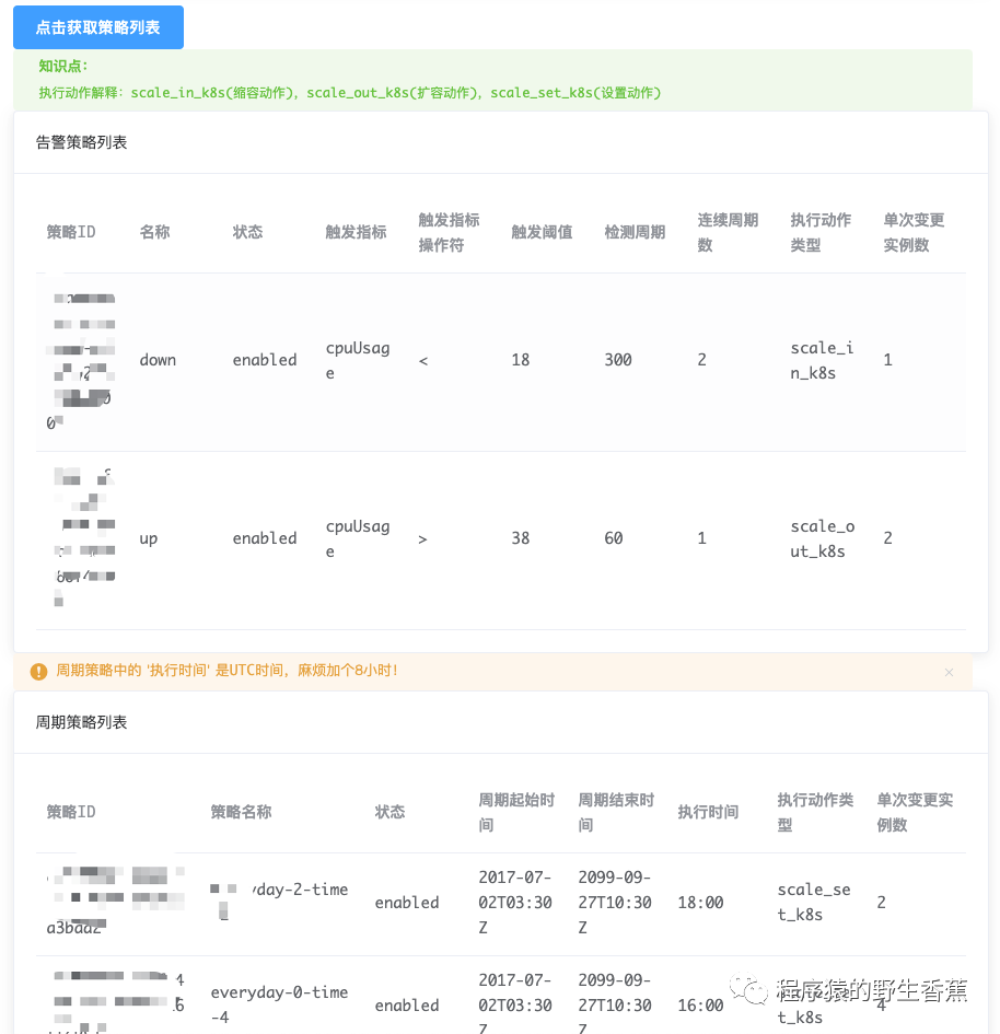 我们完全按照阿里云弹性伸缩设置默认的伸缩规则有时候可能还不能满足,借此我们可能还会设置一些定时伸缩,比如我晚上2点就让它维持两台机器。这个也是控制服务稳定性的一个操作,因为在某些时刻,服务是1台机器扛不住,两台机器会缩容的状态。我们开发了一个工具展示定时任务的列表(由于业务迁移了,所以这里没数据了,嘿嘿)