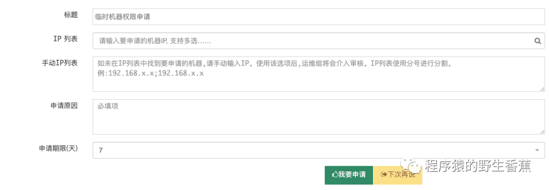 我们有自己的一套权限申请平台,相应的人员可以申请线上的机器,申请可以是临时的,也可以是拥有的。