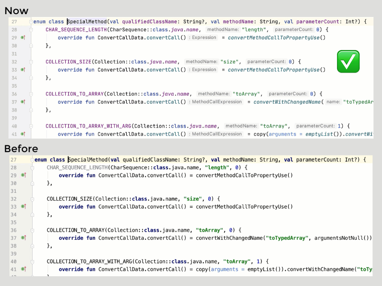 当第一次处理项目并打开一个较大的 Kotlin 文件时,现在可以更快地看到高亮显示的内容。在大多数情况下,高亮显示的速度现在提高了 1.5-4 倍: