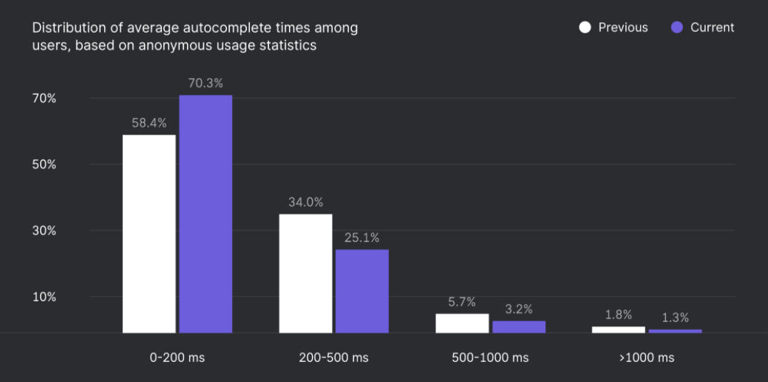 同时还大幅缩短了显示自动补全建议所花的时间。下图概述了 Kotlin 用户所经历的平均自动补全响应时间,补全时间超过 500 毫秒的情况几乎减少了一半: