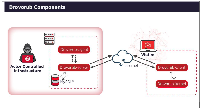 据介绍,Drovorub 是一个多组件系统,其中包括一个 implant、一个内核模块 rootkit、一个文件传输工具、一个 port-forwarding 模块以及一个命令和控制(C2)服务器。