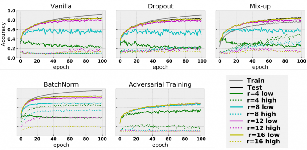 在图4中,随着训练epoch的增加,我们报告了训练数据和各种副本测试数据的准确性,其中r为我们切割LFC和HFC时所用的半径,实线/虚线分别为LFC/HFC的性能。因此,曲线的虚线越高,模型利用的HFC就越多。