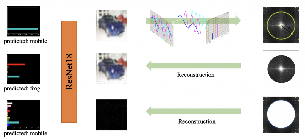 让我们从一个有趣的观察开始(图2):我们使用Cifar10数据集训练了一个ResNet-18,选择了一个测试样本,并绘制了该样本的模型预测置信值。然后通过傅里叶变换将样本映射到频域,将其频率表示分割为高频分量和低频分量。我们通过这两个部分对图像进行重构,并将重构图像输入到模型中: