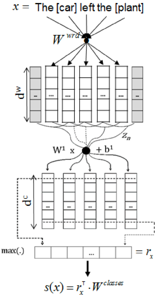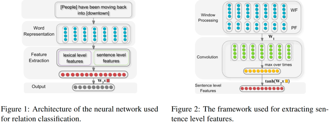 lexical level features:词汇级别特征包括实体对e1 和 e2 的词嵌入向量,e1 和 e2 的左右两边词的词嵌入向量,以及一个 WordNet 上位词向量。WordNet 上位词特征指的是 e1 和 e2 同属于哪一个上位名次,如“狗”和“猫”的上位词可以是“动物”或者“宠物”,具体需要参考的 WordNet 词典是怎样构建的。直接将上述的5个向量直接拼接构成词汇级别的特征向量 l