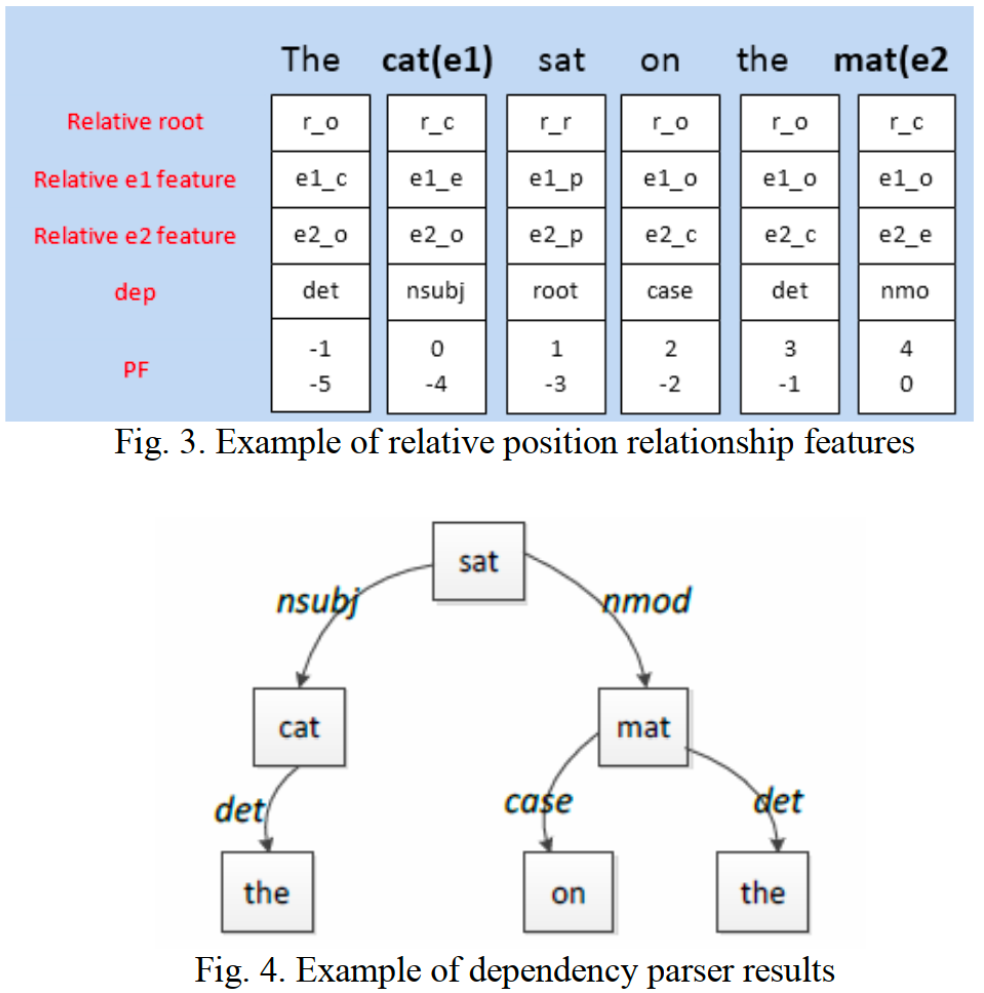 Look-up tables:包括 word embedding 层和 position embedding 层两个部分。word embedding 为预训练得到,而 position embedding 则随机初始化,两者均参与训练。对于输入句子长度,将其限定在两个实体可能的最大长度的范围内,假设句子长度为 n,用 i−i1 和 i−i2 表示地i个词距离第一个实体和第二个实体的距离,则 position embedding 层的维度为(2n−1)×md,其中md 为位置向量的维度。假设句子中第 i 个词的词向量为 ei ,位置向量为 di1 和 di2,则该词的词表征为 xi=[ei;di1;di2]