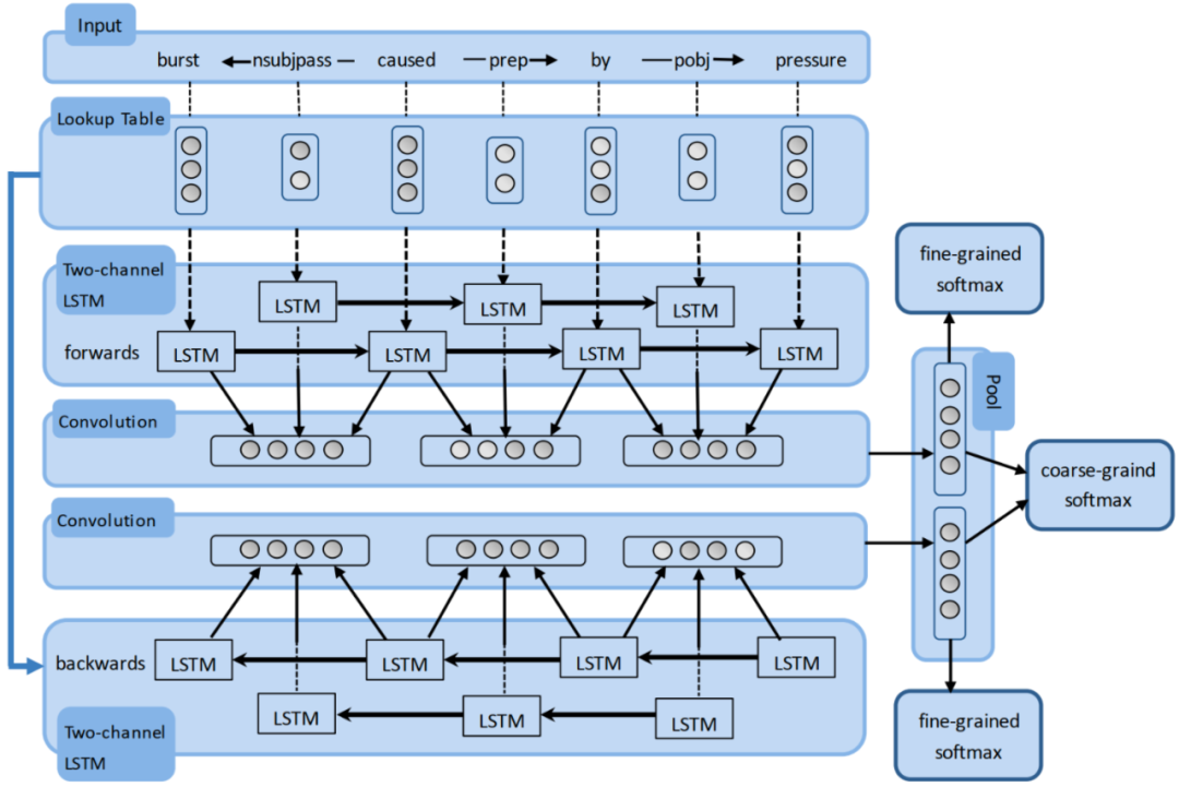 此外,作者还指出,两个实体之间的依赖关系是有向的,如上图展示的因果关系示例图,若存在K个关系,则需要将其看作 ( 2 K + 1 ) 种分类问题,其中1为 O t h e r 类。因此,作者提出其第二个贡献就在于使用双向的循环卷积神经网络 (BRCNN) 来同时学习双向的表征,可以将双向依赖问题建模为对称的依赖问题,从而将其简化为 ( K + 1 ) 的分类问题。模型细节如下图所示: