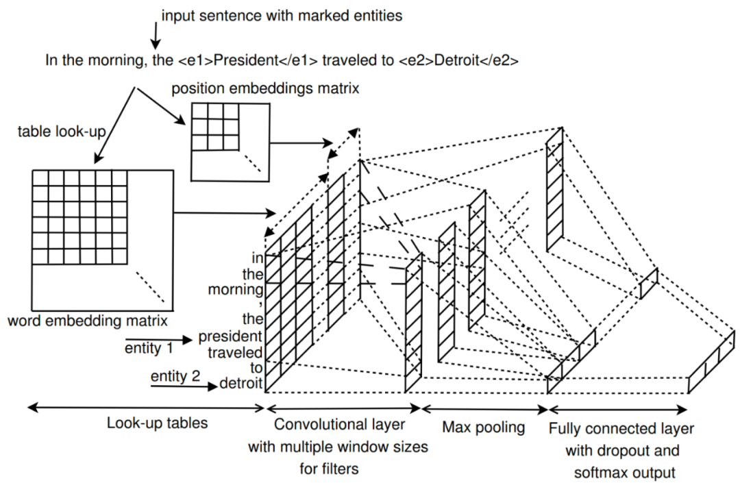论文简述: 该论文属于早期使用深度卷积网络模型解决关系抽取任务的经典论文。该论文将关系抽取问题定义为:给定一个句子S和名词对 e 1 和 e 2 ,判断 e 1 和 e 2 在句子中的关系,即将关系抽取问题等效为一个关系分类问题。与传统的方法相比,该模型只需要将整个输入句子以及简单的词信息作为输入,而不需要认为构造特征,就能得到非常好的效果。模型的主要架构如下所示: