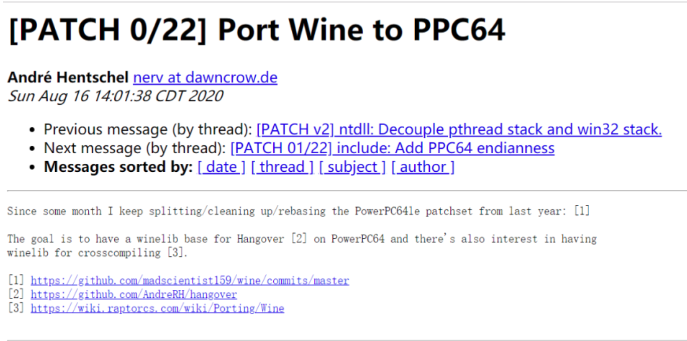 André Hentschel 发出了最新的 22 个补丁,用于将 Wine 移植到 PPC64(64 位 POWER)。这些补丁来自于去年发送的早期 POWER 补丁的 cleaning、re-basing 和 splitting up。