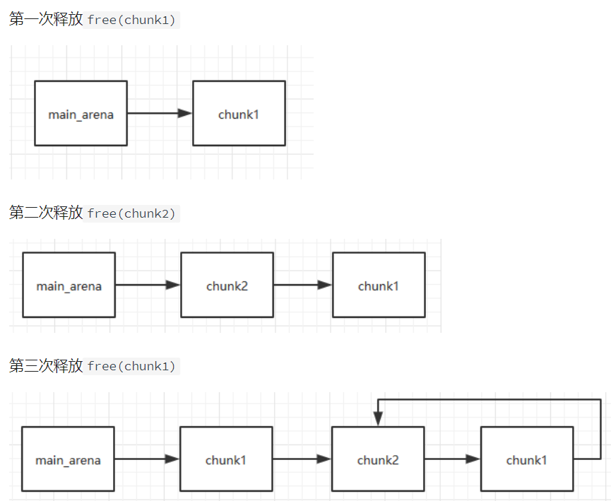 wiki 上的描述,可以看到 chunk1 的 fd 会指向 chunk2 那么如果 chunk1 是我们可控的那么就可以申请任意地址的 fastbin