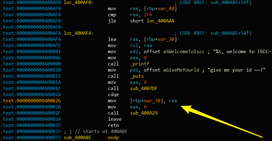 在输入 id 的那里会把输入的 id 放到 rbp-0x38 那里