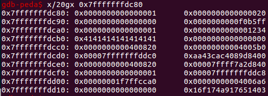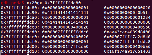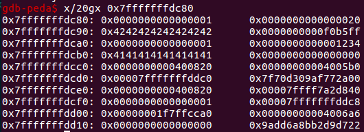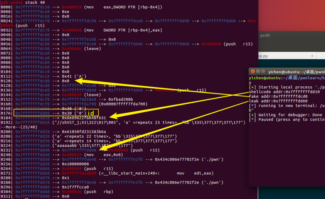 看一下栈上的结构,最上面是构造的 chunk,下面是 id(作为 next chunk size)然后是 shellcode以及之前泄露的地址