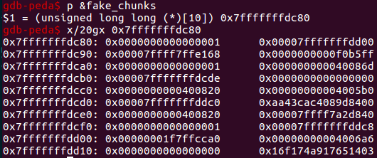 fprintf(stderr, "The first one: %p\n", &fake_chunks[0]);
