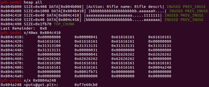 接下来需要伪造一个 chunk,因为枪支的 chunk 大小是 0x40的,而那个计数的东西在 bss 段中 0x804A2A4 的位置,每 add 一个就会 +1,可以用来作为 fake chunk 的 size,只需要多申请几个就可以