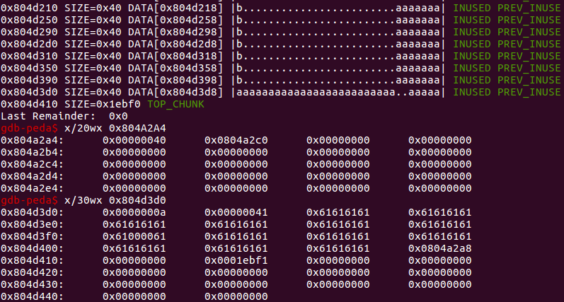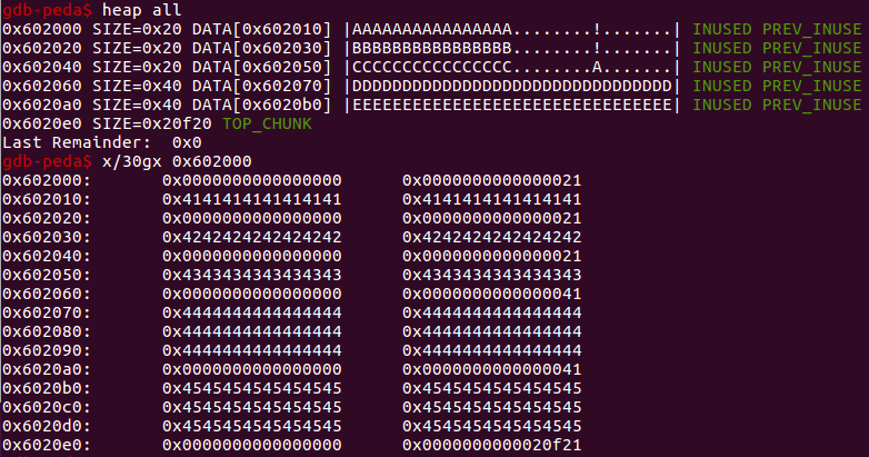 首先是 0x20 的占位留给 fake chunk,然后是 fake chunk 的 size,接下来是 next chunk 的 size