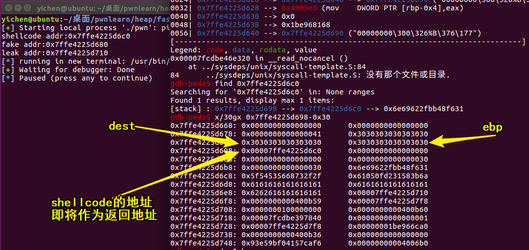 这里有点疑惑为啥会把那个伪造的 chunk 放到 fastbin?还是没把程序的功能理顺,我们把 dest 给覆盖掉了,覆盖为了 fake chunk 的地址,然后 dest 放到了 ptr,后面 free 的时候是 free(ptr) 的