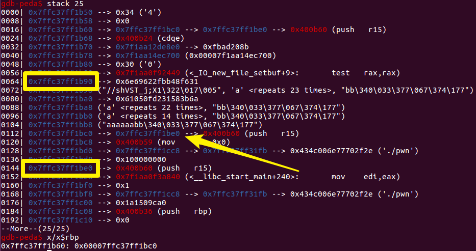 箭头指向的是 rbp,0xe0-0x90=0x50,所以 shellcode 的地址是在泄漏的那个地址减 0x50 处