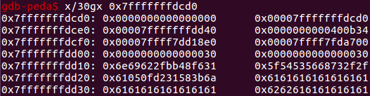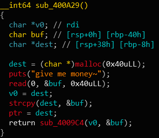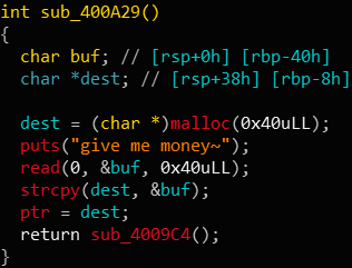 buf 在 rbp-0x40,dest 指针在 rbp-0x8,所以 buf 的最后八字节会把 dest 给覆盖掉