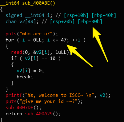 这里的 v2 是在 0x30 的位置,而 read 读入的时候可以读入 0x30,但是不会再末尾自己加上 \x00,所以如果输满了可以把后面的 rbp 给泄露出来