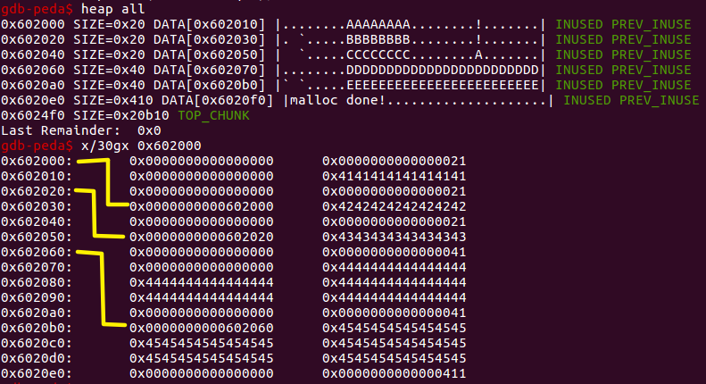 可以看出链表来,后释放的 fd 指向上一个的,而不同大小的不会指向