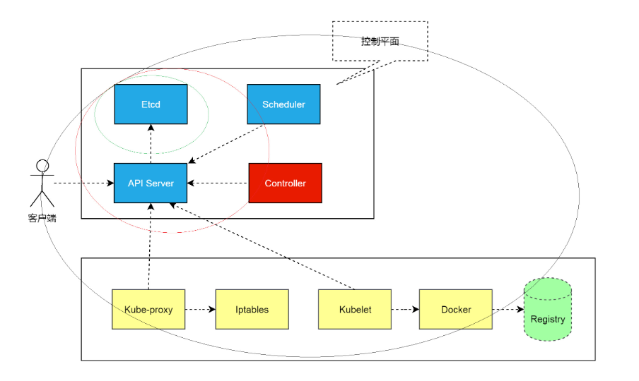 通过这幅图可以看出一个Pod在创建过程,除了APIServer之外,其它组件之间的通信都要经过APIServer。但是你可能会产生一个疑问,控制器呢?请看下图,控制器正是保证和控制服务正常运行的大脑。