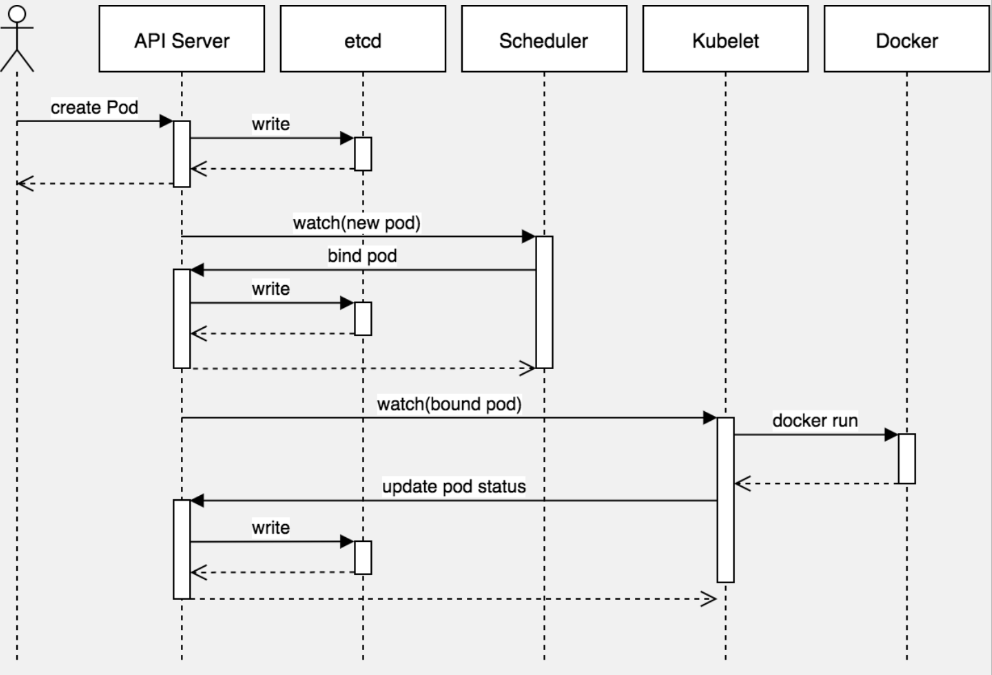 举个例子,一个Pod从提交到运行时序图,如下所示: