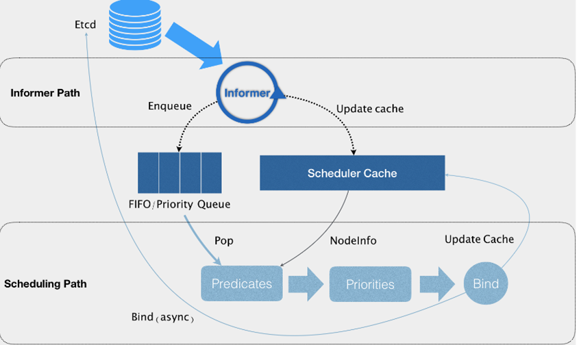 第一个控制循环我们称之为Informer Path,它启动一系列的Informer,用来监听etcd中Pod、Node、Service等资源对象的变化,并通过Informer Handler把待调度Pod加入的到优先级队列,Node等信息缓存到Cache中。