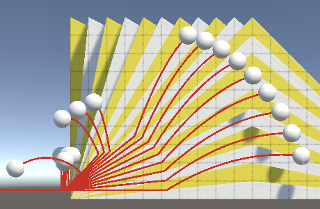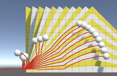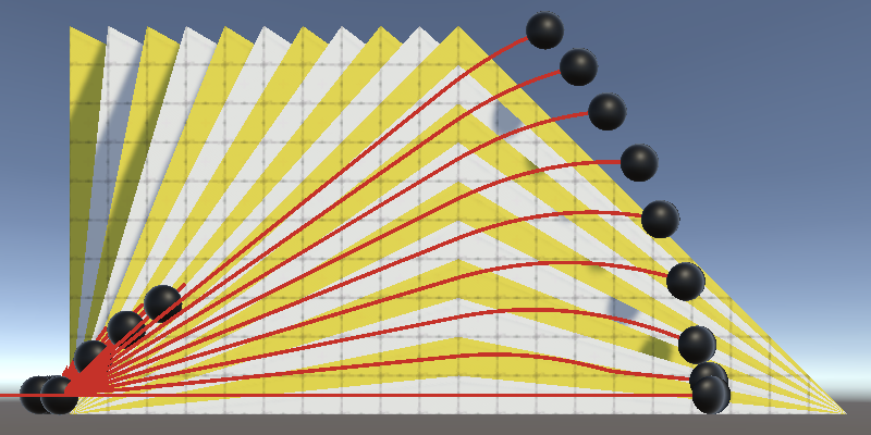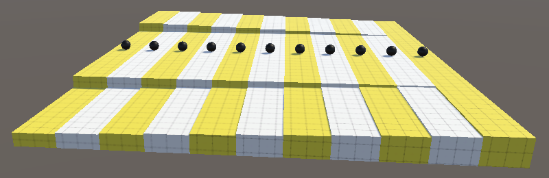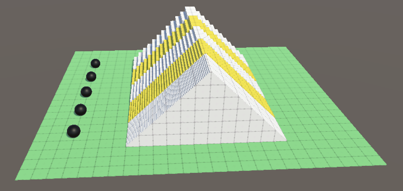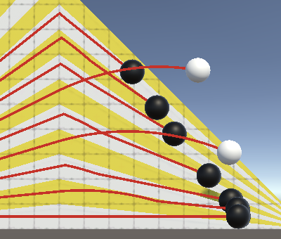 接下来让我们考虑一种更困难的表面:楼梯。实际上,球体根本无法很好地爬上楼梯,但是无论如何,我们可能希望它们这样做,也许是因为它们代表了应该能够在楼梯上导航的东西。我制作了一个测试场景,其中包含五个45°阶梯,步长分别为0.1、0.2、0.3、0.4和0.5。