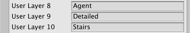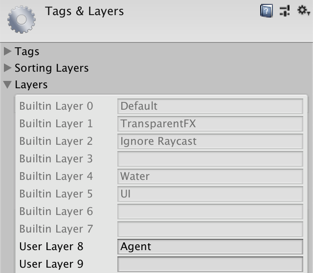 通过游戏对象的 Layer 下拉菜单中的添加图层... 选项进入图层设置。项目设置的标签和图层(Tags and Layers)部分。然后定义一个新的自定义用户层。对于不属于关卡几何体的通用活动实体,我们将其命名为 Agent 。