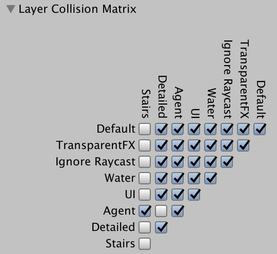 接下来,转到项目设置的物理部分,然后调整图层碰撞矩阵。楼梯仅应与代理商交互,而代理不应与 Detailed 交互。