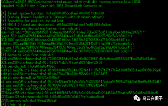 导出后可以使用mimikatz加载sam.hiv和sam.hiv来导出Hash。或者使用impacket 套件中secretsdump.py 脚本去解密,也是可以的。