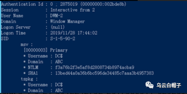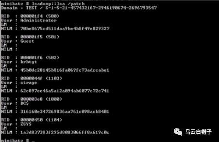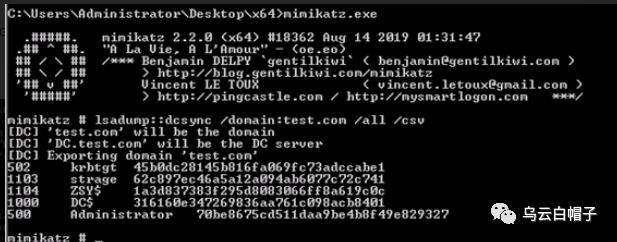 1、直接在域控制器中执行Mimikatz,通过lsass.exe进程dump出密码哈希。