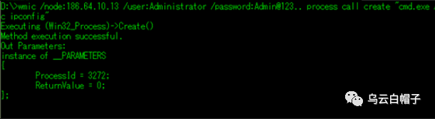 wmic /node:186.64.10.13 /user:Administrator /password:Admin@123.. process call create "cmd.exe /c ipconfig"